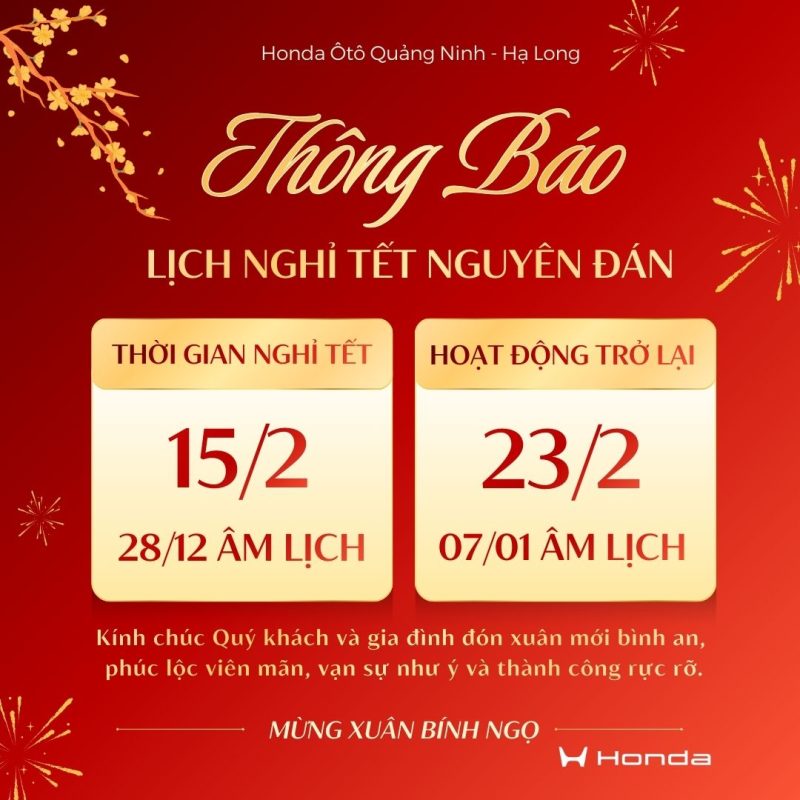 Honda Ôtô Quảng Ninh – Hạ Long trân trọng thông báo đến Quý Khách hàng lịch nghỉ Tết Nguyên Đán 2026 như sau: 1. Thời gian nghỉ Tết Từ ngày 15/02/2026 (tức 28 tháng Chạp) Đến hết ngày 22/02/2026 (tức Mùng 6 Tết) 2. Thời gian hoạt động trở lại Ngày 23/02/2026 (tức Mùng 7 […]